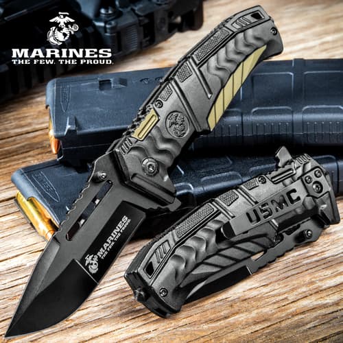 USMC Tanto Maximum Pocket Knife | 5 1/2" Blade | 12 1/2" Overall | Textured TPR and Polypropylene Handle | Steel Pocket Clip and Glass Breaker