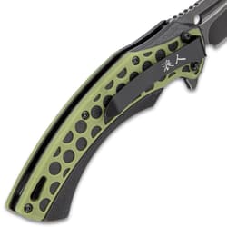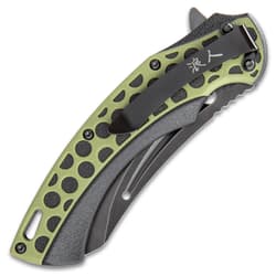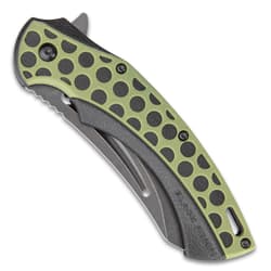 - The double-injected TPR and aluminum handle has a circular pattern and features partially serrated liners
